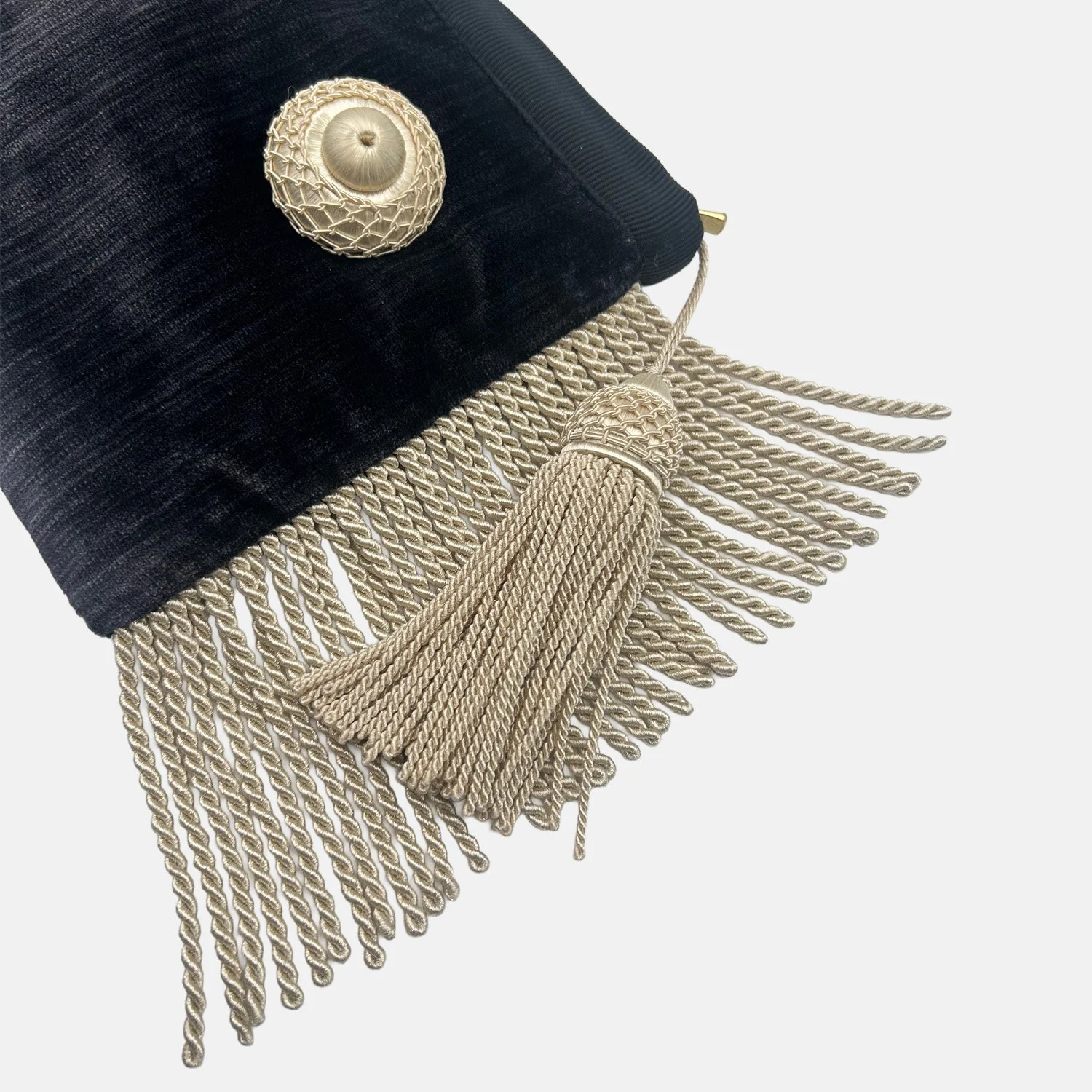 Pochette aux tons noirs est confectionnée dans un velours en velours de soie à l’ancienne qui offre de magnifiques dégradés de couleurs.